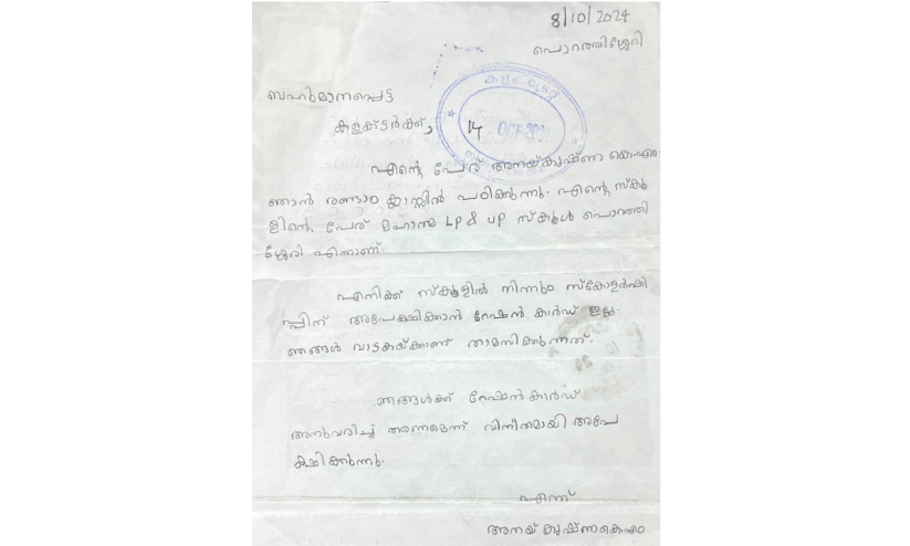 സ്വന്തം കൈപ്പടയില് കടലാസ് പെന്സൽ കൊണ്ട് എഴുതിയ കത്തിലെ ആവശ്യം കലക്ടറുടെ മനസിലുടക്കുകയായിരുന്നു. വാടകക്ക് താമസിക്കുന്ന അനയ് കൃഷ്ണയുടെ കുടുംബത്തിന് റെസിഡന്ഷ്യല് സര്ട്ടിഫിക്കറ്റ് ഇല്ലാത്തതാണ് കാര്ഡ് കിട്ടാൻ തടസമായത്.